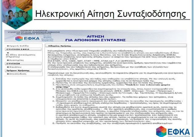 Η αίτηση συνταξιοδότησης υποβάλλεται σε ενιαία ηλεκτρονική φόρμα από όλους τους ασφαλισμένους μέσω της ιστοσελίδας του ΕΦΚΑ, με τους κωδικούς του taxisnet -διαθέσιμη εδώ- ανεξάρτητα από το πόσοι ήταν οι φορείς ασφάλισής τους. Στη συνέχεια, ο αιτών μπορεί να ενημερώνεται ηλεκτρονικά για την πορεία της αίτησης. Παράλληλα, εξακολουθεί η διάθεση έντυπων αιτήσεων για όσους επιθυμούν να υποβάλλουν την αίτηση σε έντυπη μορφή.