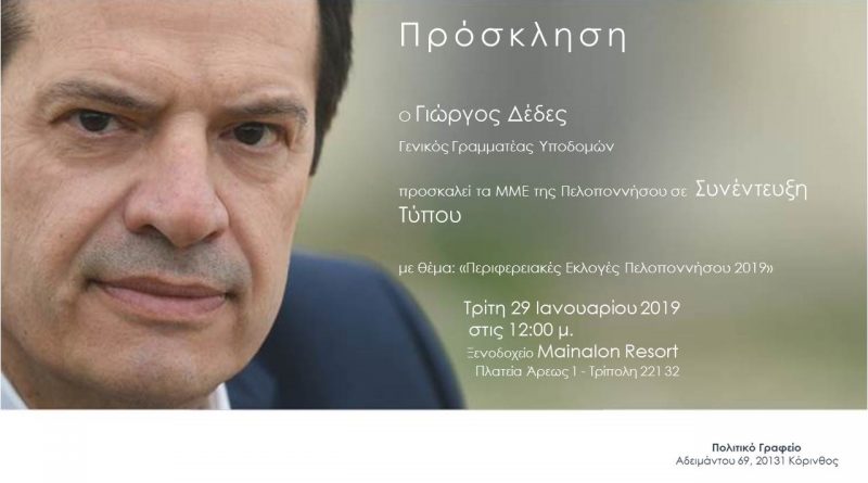 Ο υποψήφιος περιφερειάρχης Πελοποννήσου και Γενικός Γραμματέας Υποδομών, Γιώργος Δέδες, πρόκειται να κάνει την επίσημη ανακοίνωση της υποψηφιότητάς του σε συνέντευξη τύπου, που θα πραγματοποιηθεί στην Τρίπολη την Τρίτη 29 Ιανουαρίου 2019 στις 12:00 μ.μ. με θέμα:
