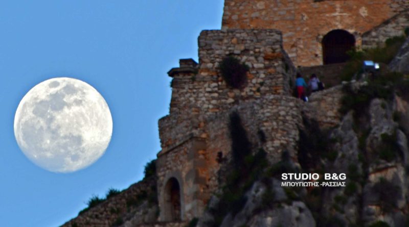 Το φεγγάρι ανατέλλει πάνω από το Ναύπλιο μία ημέρα πριν την τρίτη σε συνέχεια Υπερπανσέληνο, Τρίτη 19 Μαρτίου 2019.