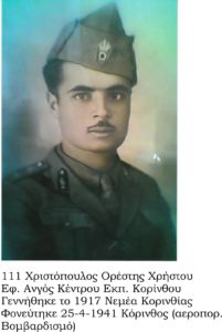Χριστόπουλος Ορέστης του Χρήστου, Έφεδρος Ανθυπολοχαγός. Γεννήθηκε στη Νεμέα Κορινθίας το 1917, του Κέντρου Εκπαίδευσης Κορίνθου. Φονεύτηκε στη Κόρινθο σε αεροπορικό βομβαρδισμό στις 25 Απριλίου 1941.