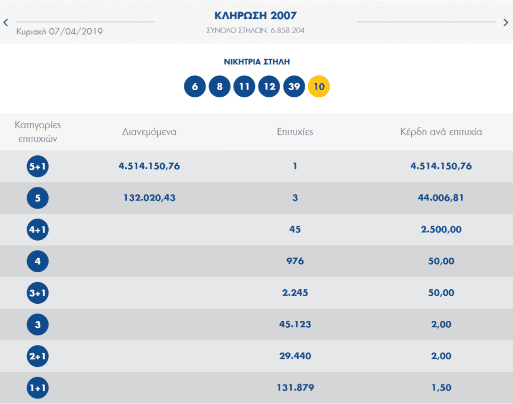Οι τυχεροί αριθμοί στη κλήρωση της Κυριακής (2007) είναι οι εξής: 6, 8, 11, 12, 39 και Τζόκερ ο αριθμός 10.
