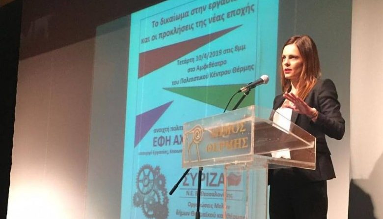 «Η εργασία ήταν και παραμένει, πριν και μετά από την έξοδο της χώρας από τα μνημόνια, στο κέντρο της αναπτυξιακής μας πολιτικής» τόνισε, σε εκδήλωση του ΣΥΡΙΖΑ Β’ Θεσσαλονίκης, στο Πολιτιστικό Κέντρο Θέρμης, η υπουργός Εργασίας Κοινωνικής Ασφάλισης και Κοινωνικής Αλληλεγγύης, Έφη Αχτσιόγλου, υπογραμμίζοντας ότι για τον ΣΥΡΙΖΑ «η επόμενη μέρα των μνημονίων έχει στο επίκεντρό της τον κόσμο της εργασίας, τους νέους, τη μεγάλη κοινωνική πλειοψηφία».