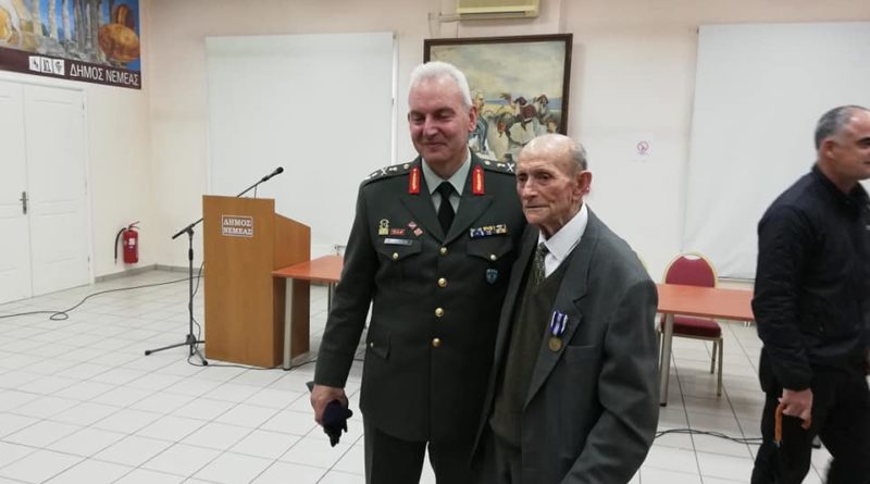 Παρασημοφόρηση του Νεμεάτη πολεμιστή του Ελληνοϊταλικού πολέμου κ. Χαράλαμπο Κουρελή 105 ετών ως αναγνώριση της προσφοράς του, από τον εκπρόσωπο του Υπουργείου Άμυνας Διοικητή της ΔΙΚΕ Πελοποννήσου Υποστράτηγο κ. Νικόλαο Λάλο.