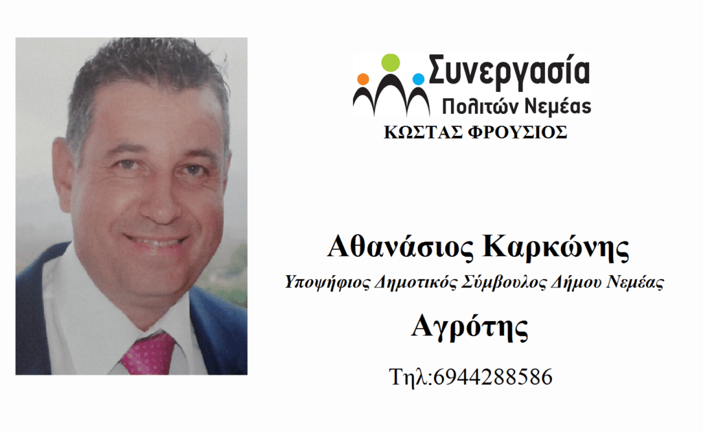 Πλησιάζοντας όλο και πιο κοντά στην 26η Μαϊου ,ο αγώνας για για τις δημοτικέ εκλογές συνεχίζεται όλο και με μεγαλύτερο ενδιαφέρον. Εγώ, ο Αθανάσιος Καρκώνης είμαι έτοιμος και πάντα δίπλα στον υποψήφιο Δήμαρχο Νεμέας Κώστα Φρούσιο να κάνω το καλύτερο για τον τόπο μας.