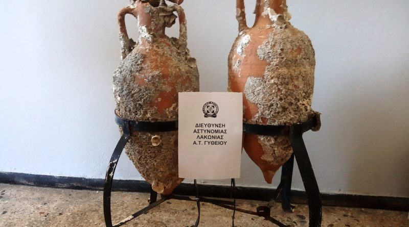 Ειδικότερα, σε τοπική κοινότητα του Δήμου Ανατολικής Μάνης Λακωνίας, αστυνομικοί πραγματοποίησαν έρευνα στην οικία του 67χρονου, όπου βρήκαν και κατέσχεσαν δύο (2) οξυπύθμενους αμφορείς προ Ελληνιστικών-Ρωμαϊκών χρόνων.