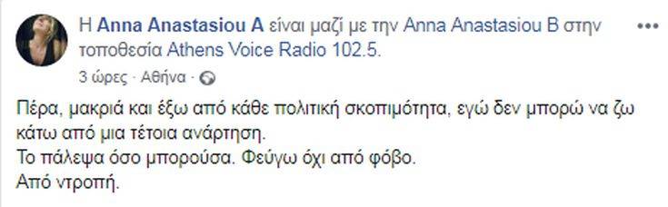 «Πέρα, μακριά και έξω από κάθε πολιτική σκοπιμότητα, εγώ δεν μπορώ να ζω κάτω από μια τέτοια ανάρτηση. Το πάλεψα όσο μπορούσα. Φεύγω όχι από φόβο. Από ντροπή» έγραψε η Άννα Αναστασίου στο προφίλ της.