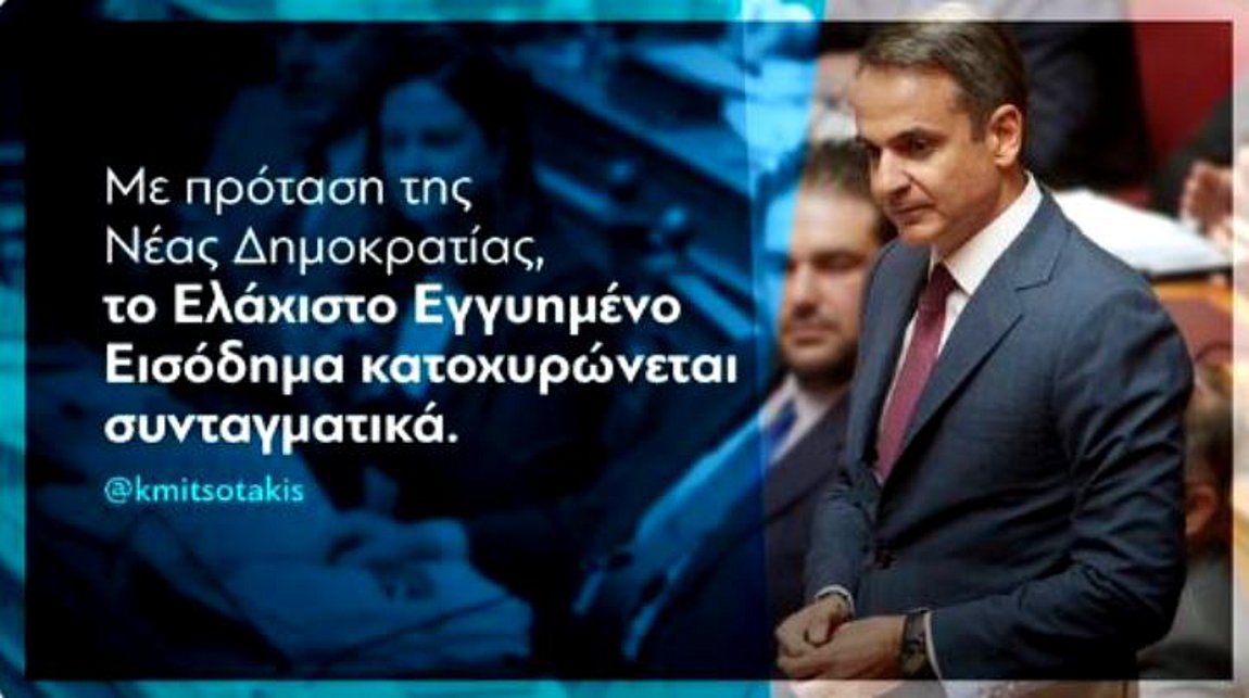 «Με τη διαδικασία που εγκαινιάστηκε στη Βουλή, η κυβέρνηση θα κατοχυρώσει συνταγματικά το ελάχιστο εγγυημένο εισόδημα, δηλαδή το δίχτυ ασφαλείας για τους πλέον αδύναμους, το οποίο πολέμησε ο ΣΥΡΙΖΑ πριν υποχρεωθεί να το υιοθετήσει. Μετά από χρόνια υποκρισίας και παλινωδιών από την πλευρά του ΣΥΡΙΖΑ, το ελληνικό κράτος με πρωτοβουλία του Κυριάκου Μητσοτάκη θα μεριμνά βάσει Συντάγματος για τη διασφάλιση συνθηκών αξιοπρεπούς διαβίωσης όλων των πολιτών μέσω ενός συστήματος ελάχιστου εγγυημένου εισοδήματος», αναφέρουν από το κυβερνών κόμμα.