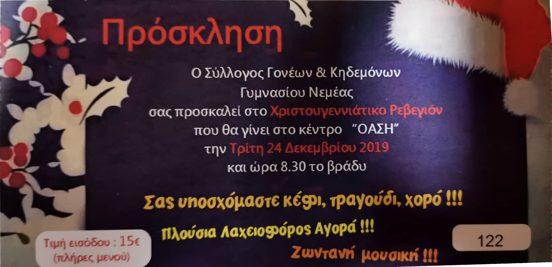 Ο Σύλλογος Γονέων και Κηδεμόνων του Γυμνασίου Νεμέας σας καλεί στο Χριστουγεννιάτικο Ρεβεγιόν πού θα γίνει στο κέντρο ΟΑΣΗ την Τρίτη 24 Δεκεμβρίου 2019