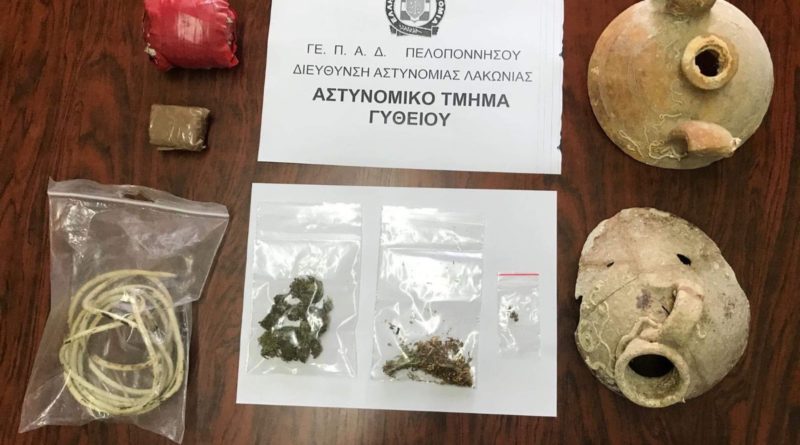 Συνελήφθησαν, χθες (12.2.2020) το μεσημέρι, από αστυνομικούς του Αστυνομικού Τμήματος Γυθείου, δύο ημεδαποί, 44 χρονος και 41χρονη, αντίστοιχα για παραβάσεις της νομοθεσίας περί προστασίας αρχαιοτήτων και εν γένει της πολιτιστικής κληρονομιάς, για τα όπλα και για τα ναρκωτικά.