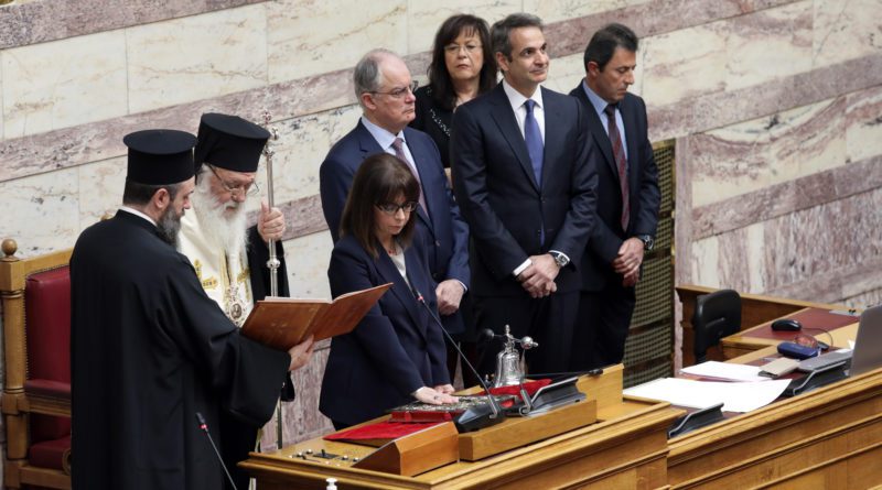 Ορκίσθηκε σήμερα ενώπιον της Ολομέλειας της Βουλής των Ελλήνων, σύμφωνα με το άρθρο 33 του Συντάγματος, η Πρόεδρος της Δημοκρατίας κύρια Κατερίνα Σακελλαροπούλου. Την Ορκωμοσία τέλεσε ο Αρχιεπίσκοπος Αθηνών και πάσης Ελλάδος κύριος Ιερώνυμος, προεξάρχων εκπροσώπων της Ιεράς Συνόδου.