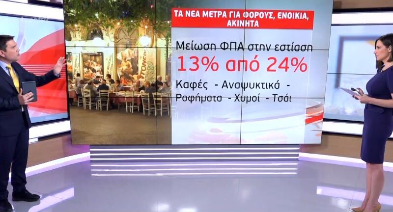 Η μείωση του συντελεστή ΦΠΑ από το 24 στο 13% αφορά στα μη αλκοολούχα ποτά, όπως ο καφές και όλα τα ροφήματα: τα αναψυκτικά, οι χυμοί και το τσάι, που σερβίρονται στον κλάδο της εστίασης.