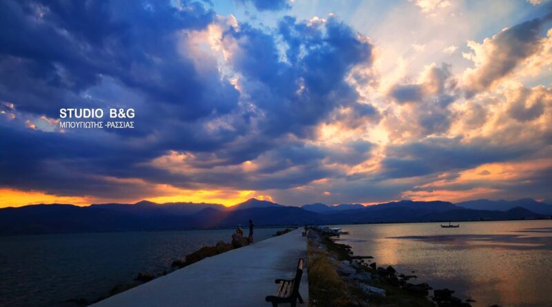 Ο ήλιος καθώς φεύγει μέσα από τα σύννεφα, δίνει στον ουρανό άλλοτε αυτό το βαθύ κόκκινο χρώμα, άλλοτε το πορτοκαλί ή το κίτρινο και άλλες φόρες μπερδεύονται όλα μαζί σε μια βιολετί απόχρωση, που με φόντο την πόλη του Ναυπλίου συνθέτουν έναν πίνακα ζωγραφικής που μόνο κάποιος μεγάλος ζωγράφος θα μπορούσε να εμπνευστεί.