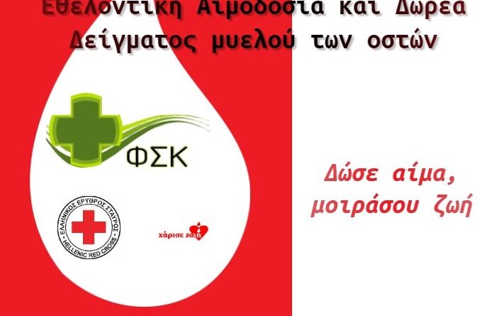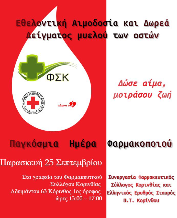 Ο Φαρμακευτικος Συλλογος Κορινθιας σε συνεργασία με τον Ελληνικό Ερυθρό Σταυρό Κορίνθου και το Γενικό Νοσοκομείο Κορίνθου, στηρίζοντας έμπρακτα έναν από τους σημαντικότερους πυλώνες του κοινωνικού εθελοντισμού συμβάλλοντας παράλληλα στην εθνική προσπάθεια για εξασφάλιση επάρκειας αίματος , διοργανώνει εθελοντική αιμοδοσία και ταυτόχρονη δράση ενημέρωσης και λήψη δείγματος για δότες μυελού των οστών σε συνεργασία με το «Χάρισε Ζωή»,