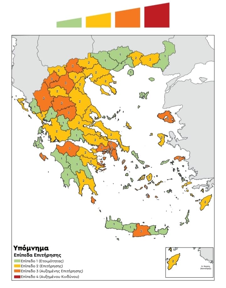 Συγκεκριμένα οι νομοί Ηλίας, Μεσσηνίας και Αρκαδίας είναι στο Επίπεδο 1 : Ετοιμότητας.