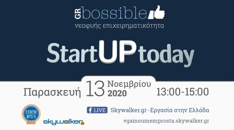 Την Παρασκευή, 13 Νοε 2020, στις 13.00 (έως 15.00) στο facebook στην σελίδα Skywalker-Εργασία στην Ελλάδα η πρωτοβουλία Enter.the.GRBossible διοργανώνει δημόσια συζήτηση εξειδικευμένων προσκεκλημένων εισηγητών με αντικείμενο την υποστήριξη της νεοφυούς επιχειρηματικότητας σήμερα και τίτλο «Start up today».
