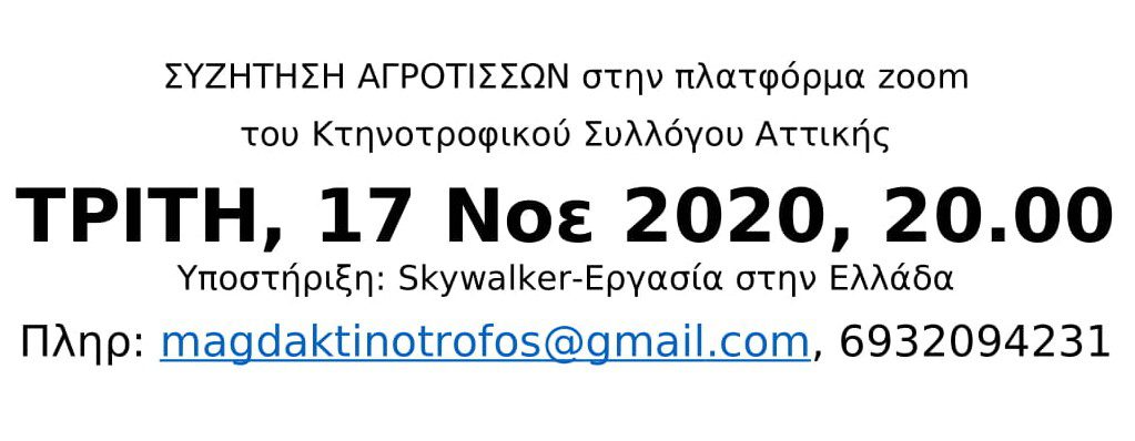 Την Τρίτη, 1 Δεκ 2020, στις 20.00, όπως κάθε Τρίτη βράδυ οι Αγρότισσες της Ελλάδας οργανώνουν μια ακόμα δημόσια διαδικτυακή συζήτηση στην πλατφόρμα zoom του Κτηνοτροφικού Συλλόγου Αττικής.