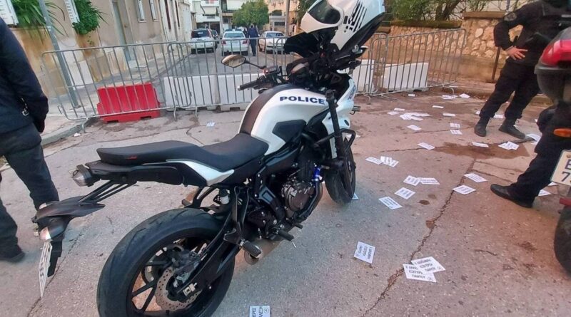 Η ομάδα των ατόμων πέταξε φέιγ βολάν και επιχείρησε να προσεγγίσει το Αστυνομικό Τμήμα του Κολωνού, ωστόσο, τους εμπόδισαν αστυνομικοί της “ΔΙΑΣ”, της ομάδας “Δράση” και των ΜΑΤ.