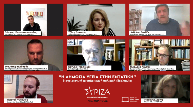 Με καλεσμένους τον Ανδρέα Ξανθό τομεάρχη Υγείας της Κ.Ο. ΣΥΡΙΖΑ-ΠΣ, τον Γιάννη Μπασκόζο, ειδικό σύμβουλο του Παγκόσμιου Οργανισμού Υγείας, τον Σταμάτη Βαρδαρό, επιστημονικό συντονιστή, του τομέα υγείας ΣΥΡΙΖΑ, με τις παρεμβάσεις του Νίκου ΚαμπάΔ/ντή της Μαιευτικής Κλινικής του Νοσοκομείου Κορίνθου, του Γιώργου Ψυχογιού βουλευτή ΣΥΡΙΖΑ-ΠΣ Κορινθίας, της Μαρίας Θελερίτη μέλους της Κ.Ε. του ΣΥΡΙΖΑ-ΠΣ, του Γιώργου Παπασταμόπουλου συντονιστή ΝΕ ΣΥΡΙΖΑ-ΠΣ Κορινθίας και υπό το συντονισμό της δημοσιογράφου Τζένης Σουκαρά, στην εκδήλωση έγινε διεξοδική αναφορά σε σημαντικά ζητήματα της Υγείας εν μέσω πανδημίας.