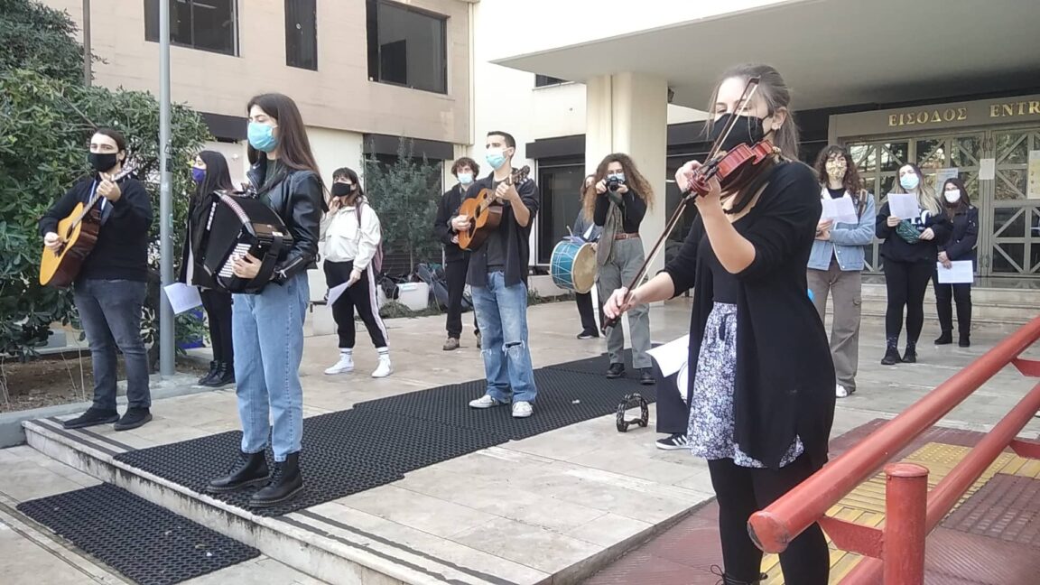 Δεκάδες άτομα συμμετείχαν στην κινητοποίηση του Συλλόγου φοιτητών/ φοιτητριών του Τμήματος Μουσικής και Τέχνης του ΠΑΜΑΚ διεκδικώντας, με συνθήματα και τραγούδια, τη χρηματοδότηση των Πανεπιστημίων και όχι της αστυνομίας, την απόσυρση του νομοσχεδίου Κεραμέως-Χρυσοχοΐδη, το άνοιγμα των σχολών με όλα τα απαραίτητα υγειονομικά μέτρα.