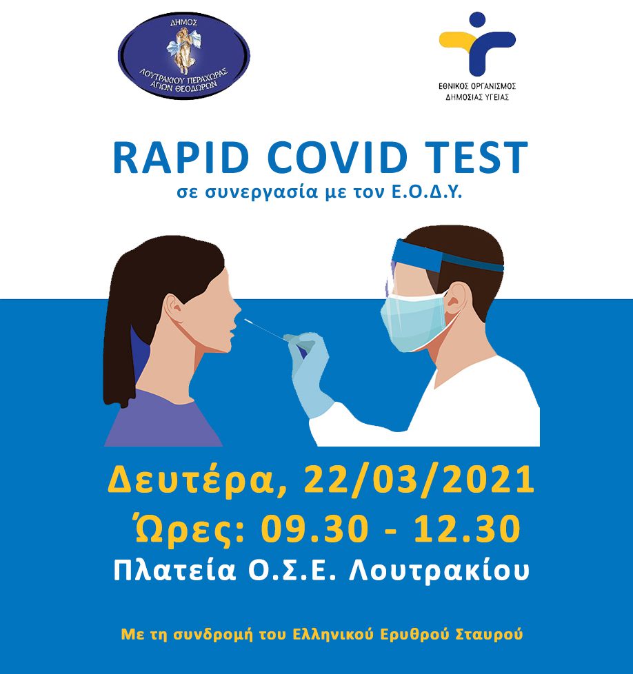 Ο Εθνικός Οργανισμός Δημόσιας Υγείας (ΕΟΔΥ) σε συνεργασία με τον Ερυθρό Σταυρό Κορίνθου και τον Δήμο Λουτρακίου – Περαχώρας – Αγίων Θεοδώρων θα διεξάγουν δωρεάν ελέγχους ταχείας ανίχνευσης αντιγόνου (rapid test) Covid-19, τη Δευτέρα 22 Μαρτίου 2021, στο Λουτράκι.