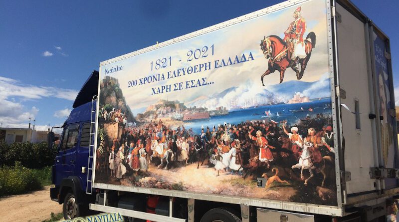 Εντυπωσίασε ο πρόεδρος της κοινότητας Δρεπάνου Ναυπλίου Σωκράτης Δωρής με την πρωτοβουλία του να ντύσει το φορτηγό του με τους ήρωες του ’21 για να γιορτάσει τα 200 χρόνια.
