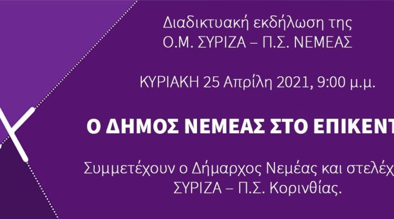 Δείτε LIVE από το nemeapress τη διαδικτυακή εκδήλωση ΣΥΡΙΖΑ Νεμέας: Ο Δήμος Νεμέας στο επίκεντρο