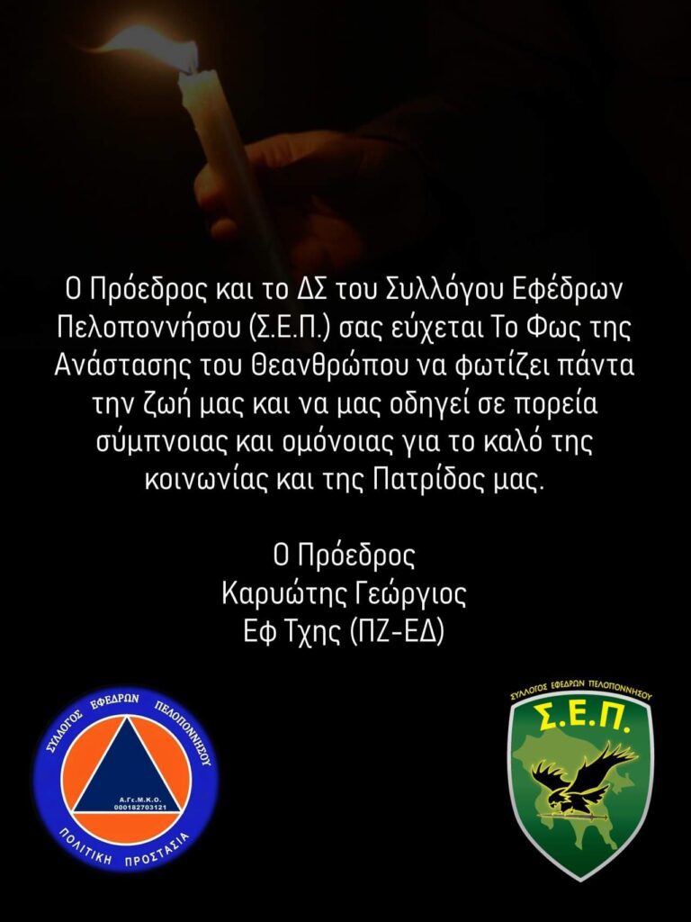 Ο Πρόεδρος και το ΔΣ του Συλλόγου Εφέδρων Πελοποννήσου (Σ.Ε.Π.) σας εύχεται Το φως της Ανάστασης του Θεανθρώπου να φωτίζει πάντα την ζωή μας και να μας οδηγεί, σε πορεία σύμπνοιας και ομόνοιας, για το καλό της κοινωνίας και της Πατρίδας μας.