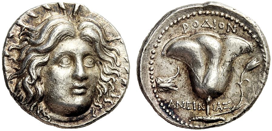 Στον εμπροσθότυπο έφερε την κεφαλή του θεού Ηλίου με ακτίνες  προς την περιφέρεια. Στον οπισθότυπο έφερε πλώρη πλοίου προς τα αριστερά και άνθος προς τα δεξιά. Σε διαμετρικές θέσεις στο περίγραμμα έφερε επιγραφή στο άνω μέρος ΡΟΔΙΩΝ και στο κάτω μέρος ΑΜΕΙΝΙΑΣ. Το έτος κοπής προσδιορίζεται περίπου το 200 π.Χ.