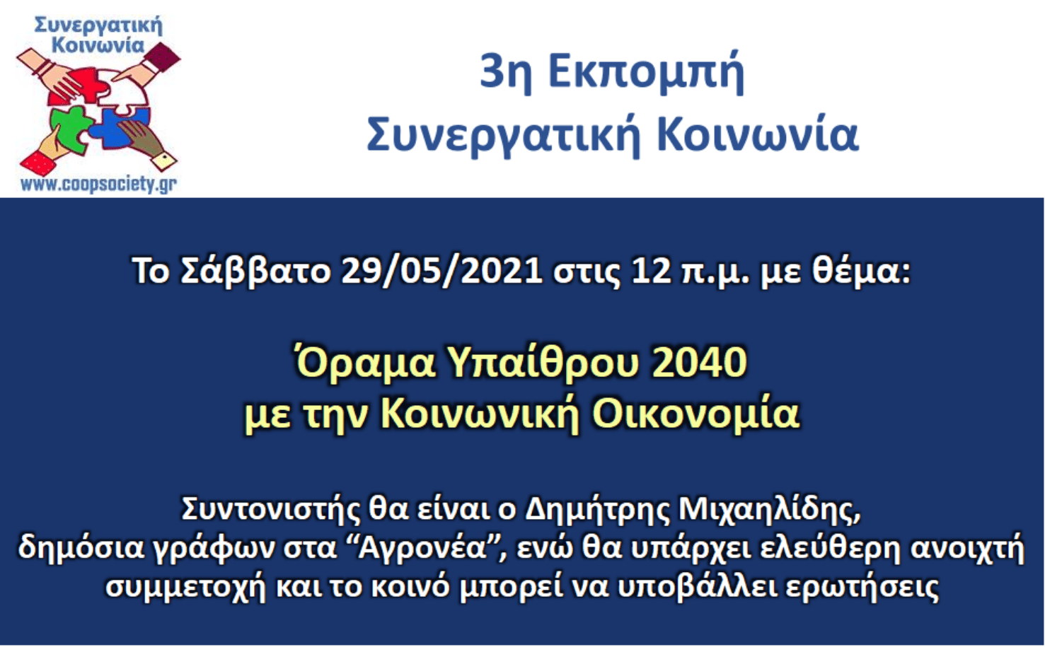 - επίσης το Σάββατο, 29/5/2021, στις 12.00 θα παρουσιάσουν το μακροπρόθεσμο «ΟΡΑΜΑ της υπαίθρου για το 2040» στην ΣΥΝΕΡΓΑΤΙΚΗ ΚΟΙΝΩΝΙΑ στο https://us02web.zoom.us/j/87405346845?pwd=MUNMd202NEQ3MDFVK3hnRTZSY0FpQT09