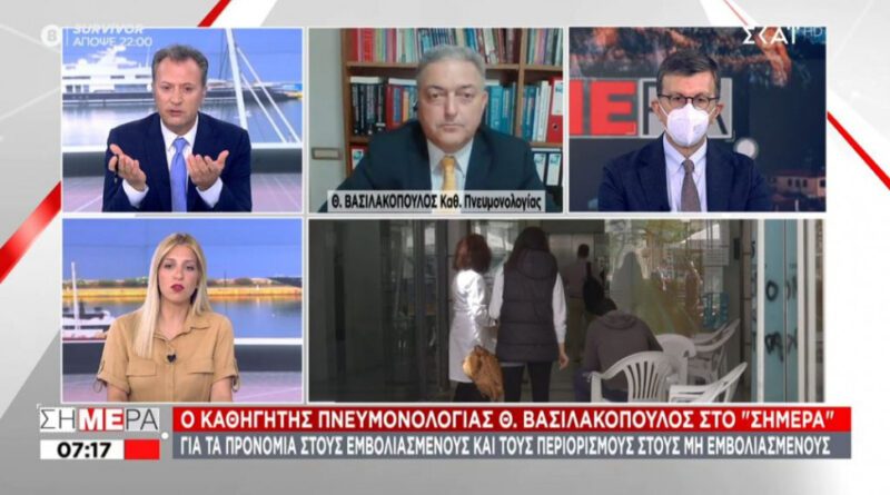 Να δοθούν προνόμια στους πολίτες που έχουν εμβολιαστεί πλήρως κατά του κορονοϊού και να υπάρξουν περιορισμοί για όσους δεν έχουν πεισθεί να το κάνουν, ανέφερε ο Θεόδωρος Βασιλακόπουλος καθηγητής πνευμονολογίας του ΕΚΠΑ μιλώντας στην τηλεόραση του ΣΚΑΪ και την εκπομπή «Σήμερα».