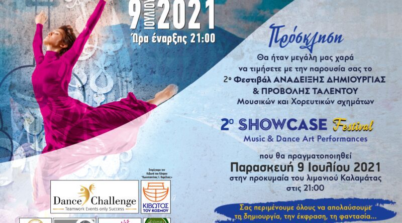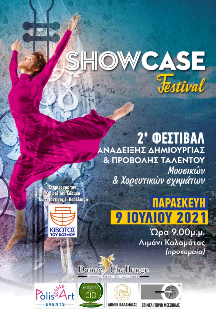 Το μοναδικό πολιτιστικό Φεστιβάλ μουσικών και χορευτικών σχημάτων στην Πελοπόννησο, που εμπνεύστηκε και προσπαθεί να καθιερώσει εθελοντικά η Νίνα Δράκου σε συνεργασία με όλους τους καλλιτεχνικούς φορείς Μεσσηνίας και το Τμήμα Καλαμάτας Διεθνούς Συμβουλίου Χορού – Cid Unesco, παρουσιάζεται για δεύτερη χρονιά με στόχο να προσφέρει ένα σημαντικό βήμα ομαδικής έκφρασης και δημιουργίας στον τόπο μας. To 2ο Showcase Festiva υποστηρίζεται από τον Δήμο Καλαμάτας, και το Επιμελητήριο Μεσσηνίας, ενώ συστήνεται και προωθείται από πολλούς άλλους φορείς.