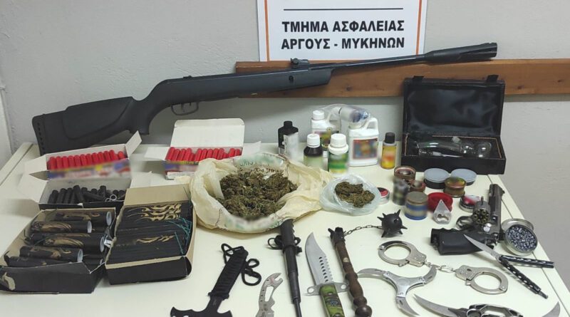 Συνελήφθη, προχθές (22.7.2021) το απόγευμα, σε τοπική κοινότητα του Δήμου Άργους-Μυκηνών Αργολίδας, από αστυνομικούς του Τμήματος Ασφάλειας Άργους-Μυκηνών, 38χρονος ημεδαπός, για ναρκωτικά , ενώ για την ίδια υπόθεση κατηγορείται ακόμη ένας 34χρονος ημεδαπός, για παράβαση των νομοθεσιών για τα ναρκωτικά, τα όπλα και των βεγγαλικών – κροτίδων.