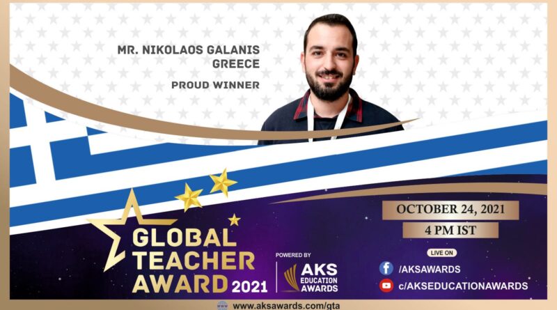 Ο Νικόλαος Γαλάνης είναι ο Έλληνας δάσκαλος που τιμήθηκε με το Global Teacher Award στα ομώνυμα βραβεία που δίνει κάθε χρόνο ο μεγάλος εκπαιδευτικός οργανισμός AKS Education, σε εκπαιδευτικούς από όλο τον κόσμο που ξεχώρισαν με την προσφορά τους. Η επιλογή του κ. Γαλάνη αποτελεί τιμή για την Ελληνική δημόσια εκπαίδευση.