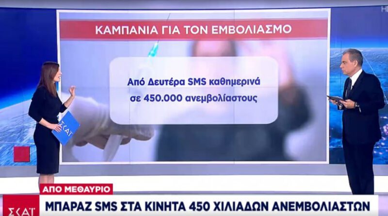Από τη Δευτέρα, 1 Νοεμβρίου, και καθημερινά θα στέλνονται μηνύματα στα κινητά τηλέφωνα 450.000 ανεμβολίαστων. Τα μηνύματα θα έχουν σκοπό την προτροπή τους για να εμβολιαστούν κατά του κορωνοϊού.