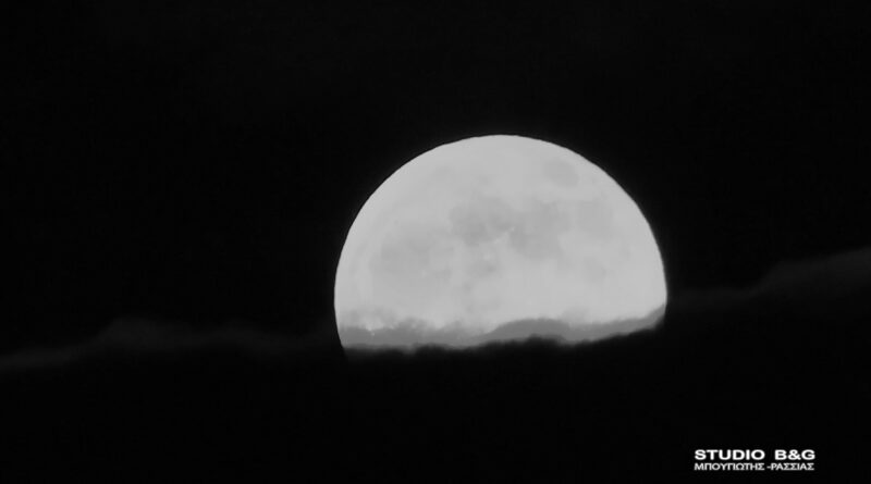 Το φεγγάρι ανατέλλει στον ουρανό του Ναυπλίου μέσα από τα πυκνά σύννεφα, Παρασκευή 19 Νοεμβρίου 2021.