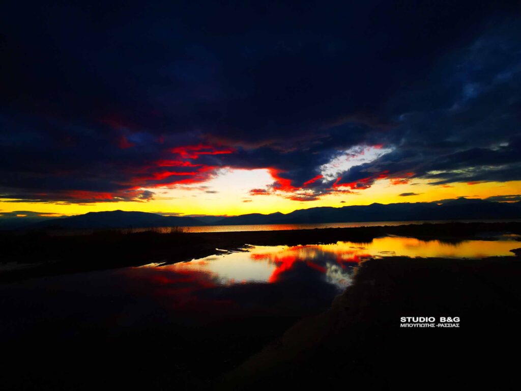Ο ήλιος δύει στο Ναύπλιο και ο ουρανός ντύνεται σε αποχρώσεις του κόκκινου και του γαλάζιου με μενεξεδί τόνους, δημιουργώντας έναν πίνακα ζωγραφικής που ανταμείβει όσους αρέσκονται να παρακολουθούν το ηλιοβασίλεμα στην παραλιακή Ναυπλίου Νέας Κίου , Τρίτη 14 Δεκεμβρίου 2021.