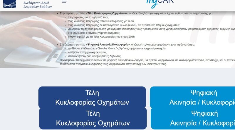 Τα ειδοποιητήρια για τα τέλη κυκλοφορίας 2022 βρίσκονται δημοσιευμένα στην ιστοσελίδα της ΑΑΔΕ, στην πλατφόρμα MyCar.