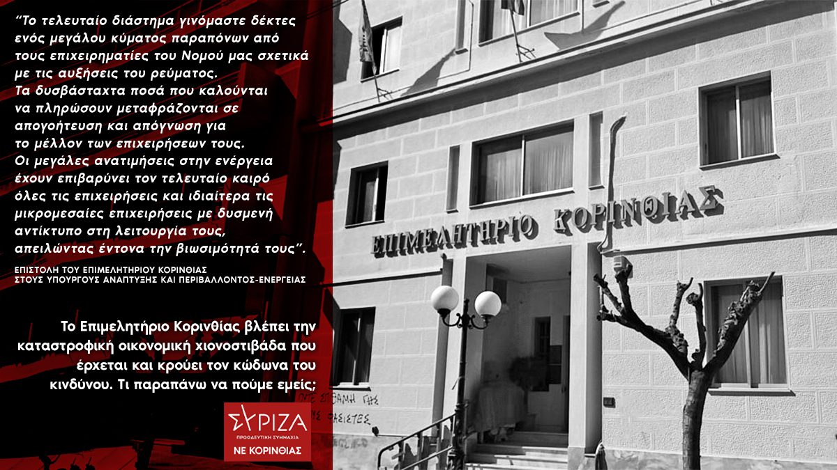 Η ανεργία, η φτώχεια, η ανέχεια, η κοινωνική αποδόμηση, χτυπούν την πόρτα της ήδη εύθραυστης οικονομικής ζωής στην Κορινθία και η κυβέρνηση περί άλλων τυρβάζει. Ο νομός μας δέχεται πολλαπλά χτυπήματα από τις αγροτικές καλλιέργειες που φέτος καταστράφηκαν, από τη σταφίδα που δεινοπάθησε, από τη Διώρυγα που παραμένει κλειστή, από τις μικρομεσαίες επιχειρήσεις που δέχονται το τελειωτικό χτύπημα με τις υπέρογκες αυξήσεις στην ηλεκτρική ενέργεια.