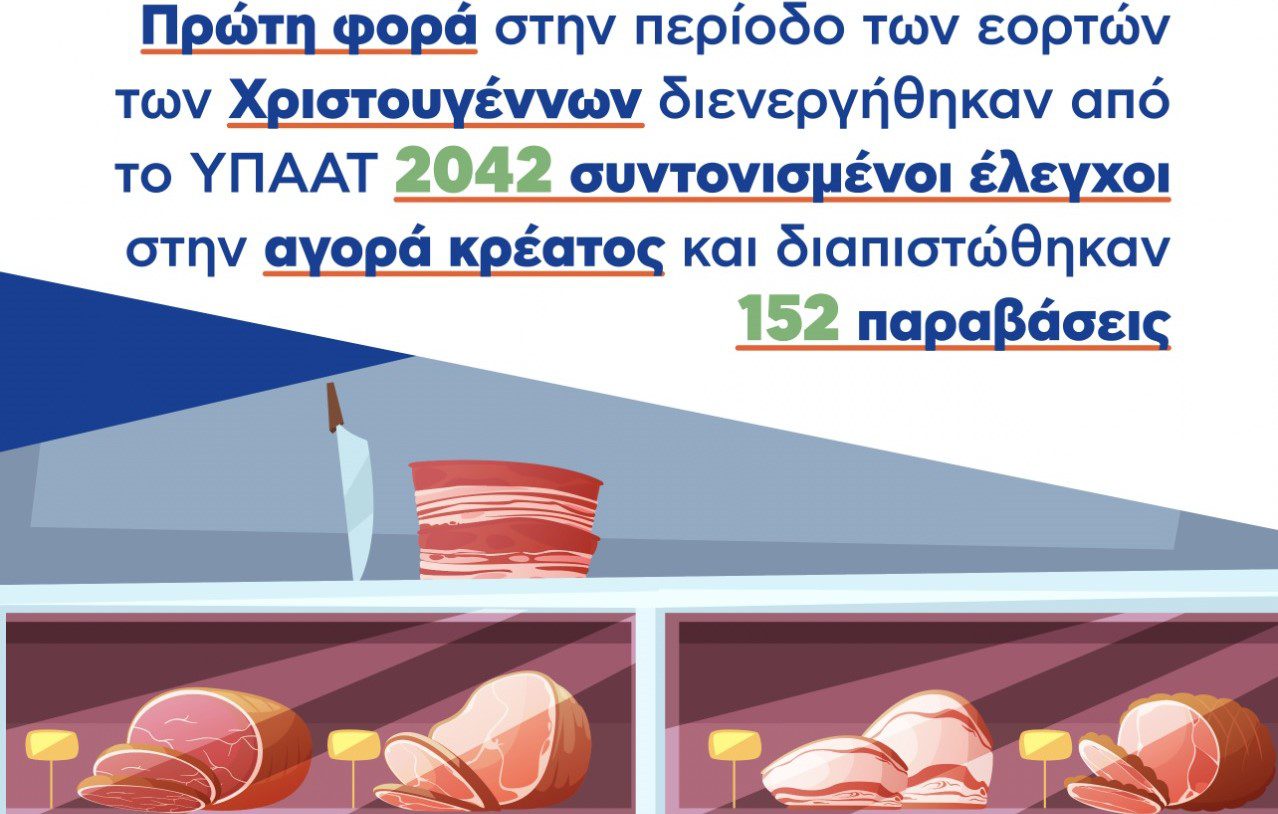 Οι αρμόδιες υπηρεσίες του ΥπΑΑΤ διενήργησαν συντονισμένα, για πρώτη φορά, στην περίοδο των εορτών των Χριστουγέννων, 2042 ελέγχους στην αλυσίδα διακίνησης κρέατος.