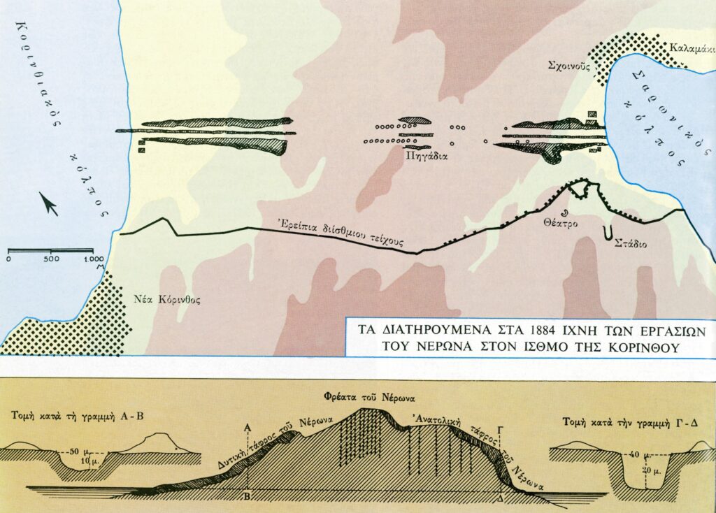 The works continued unimpeded for two months under Nero’s supervision, until his urgent return to Rome, owing to a rebellion in which most of the Emperor’s provinces took part. The canal works continued for some time, under the supervision of Vaspasian, but definitely ceased, however, after Nero was murdered.