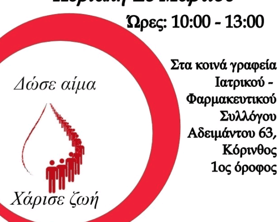 ο Ελληνικός Ερυθρός Σταυρός Κορίνθου ενώνουν τις δυνάμεις τους, στηρίζοντας έμπρακτα έναν από τους σημαντικότερους πυλώνες του κοινωνικού εθελοντισμού συμβάλλοντας παράλληλα στην εθνική προσπάθεια για εξασφάλιση επάρκειας αίματος και διοργανώνουν εθελοντική αιμοδοσία και ταυτόχρονα ενημέρωση για δότες μυελού των οστών σε συνεργασία με το «Χάρισε Ζωή».