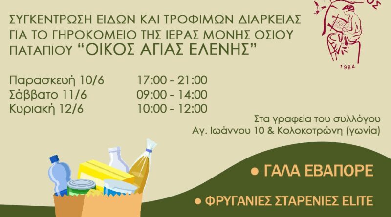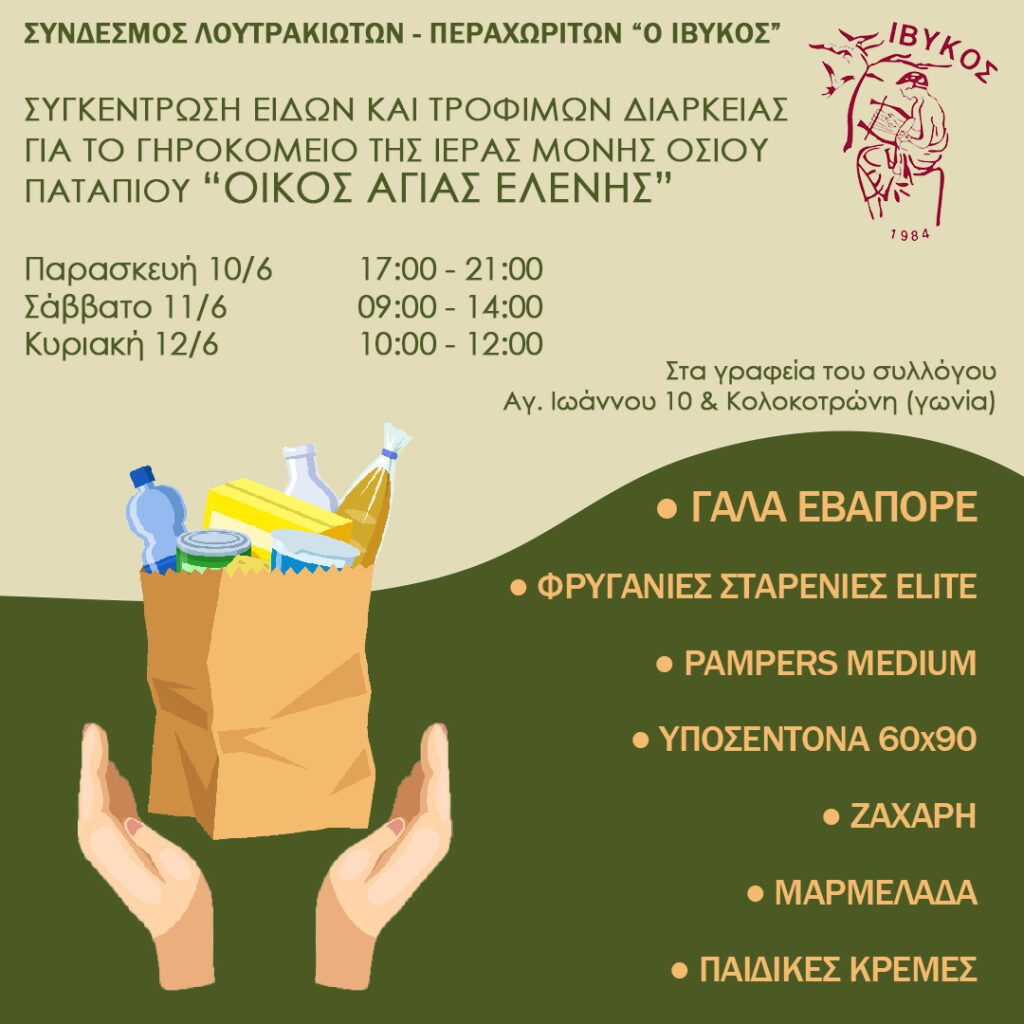 Ο «Σύνδεσμος Λουτρακιωτών Περαχωριτών – Ο Ίβυκος», συγκεντρώνει είδη και τρόφιμα μακράς διαρκείας για το Γηροκομείο γυναικών της Ιεράς Μονής Οσίου Παταπίου, «Οίκος Αγίας Ελένης».