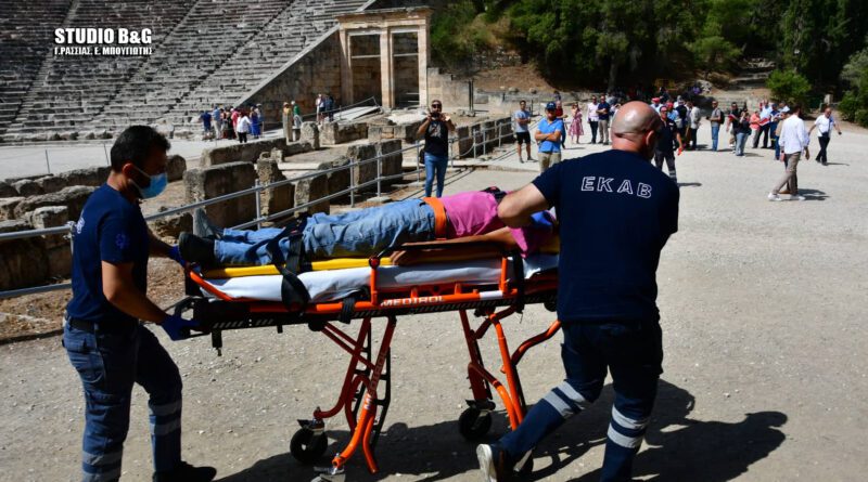 Άσκηση προληπτικής απομάκρυνσης των επισκεπτών, σε περίπτωση πυρκαγιάς, πραγματοποιήθηκε στον αρχαιολογικό χώρο της Επιδαύρου, παρουσία του Γενικού γραμματέα του Υπουργείου Πολιτισμού Γιώργου Διδασκάλου και του αναπληρωτή Γεν. Γραμματέα Πολιτικής Προστασίας Γιώργου Καραγιάννη, Πέμπτη 8 Ιουνίου 2022.