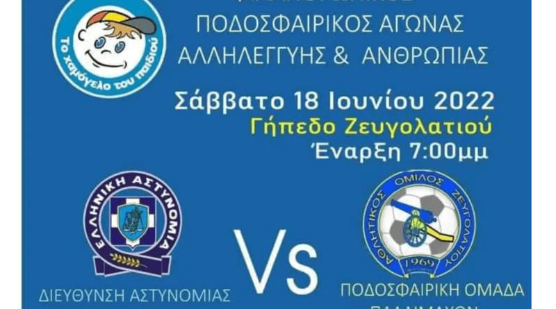 Οι φίλοι του ποδοσφαίρου, το Σάββατο 18 Ιουνίου, στις 19:00μμ, θα έχουν την ευκαιρία να παρακολουθήσουν στο Γήπεδο του Ζευγολατιού, φιλικό αγώνα ποδοσφαίρου των ομάδων: Διεύθυνση Αστυνομίας Ν. Κορινθίας και Ποδοσφαιρική ομάδα Παλαιμάχων ΑΟΖ.
