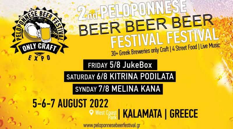 Το 2nd Peloponnese Beer Festival only craft είναι γεγονός. Το φεστιβάλ χειροποίητης μπύρας, που αγαπήθηκε τόσο πολύ, θα πραγματοποιηθεί για δεύτερη συνεχόμενη χρονιά 5-6-7 Αυγούστου 2022 στην Καλαμάτα στο Πάρκο Δυτικής Παραλίας, με παράλληλες συναυλίες ΚΙΤΡΙΝΑ ΠΟΔΗΛΑΤΑ, ΜΕΛΙΝΑ ΚΑΝΑ και πολλές εκπλήξεις!!