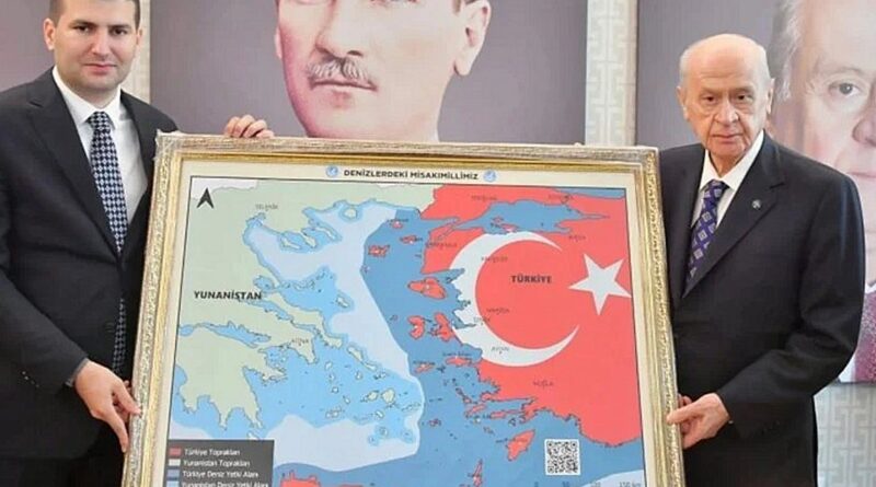 Ο Μπαχτσελί με χάρτη που δείχνει την Κρήτη και το μισό Αιγαίο ως μέρος της Τουρκίας