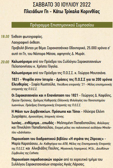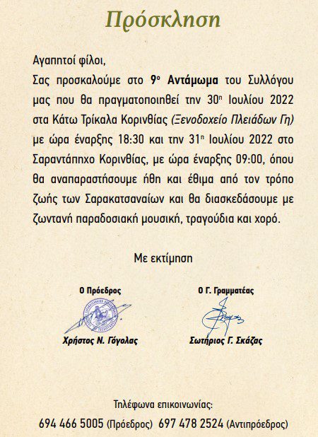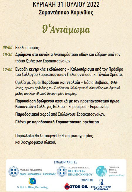 Την Κυριακή 31-07-2022 στο αισθητικό δάσος του Σαραντάπηχου του Δήμου Ξυλοκάστρου – Ευρωστίνης και από τις 9π.μ. λαμβάνει χώρα το 9ο ετήσιο Αντάμωμα του Συλλόγου Σαρακατσαναίων Πελοποννήσου.