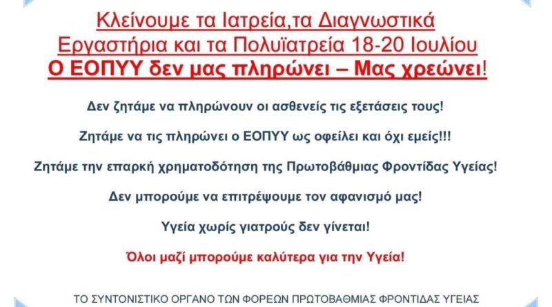 Με δεδομένο ότι δεν υπάρχει καμία δέσμευση για περαιτέρω ενέργειες από την πλευρά του Υπουργού, εξαγγέλλουμε την έναρξη απεργιακών κινητοποιήσεων από την πλευρά των διαγνωστικών εργαστηρίων, των πολυϊατρείων και τον κλινικοεργαστηριακών γιατρών από 18 έως 20 Ιουλίου 2022.