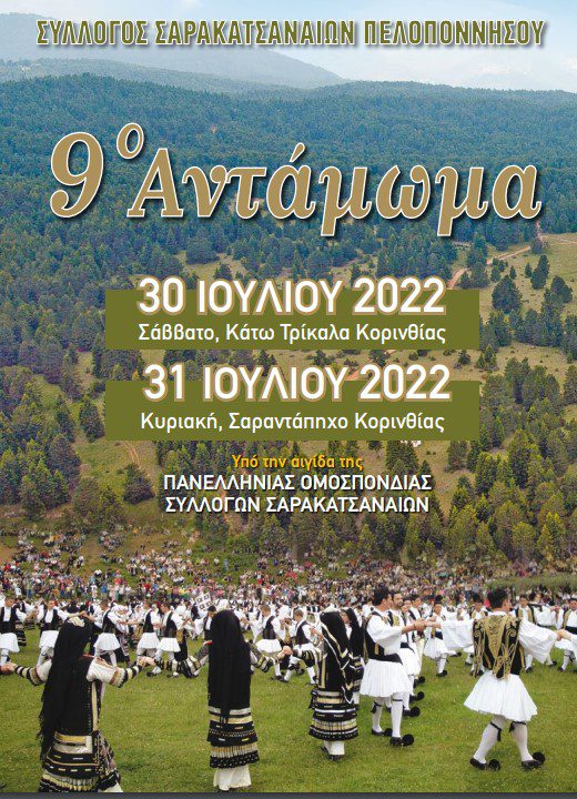 Σας προσκαλούμε στο 9ο Αντάμωμα του Συλλόγου μας που θα πραγματοποιηθεί την 30η Ιουλίου 2022 στα Κάτω Τρίκαλα Κορινθίας (Ξενοδοχείο Πλειάδων Γη)με ώρα έναρξης 18:30 και την 31η Ιουλίου 2022 στο Σαραντάπηχο Κορινθίας, με ώρα έναρξης 09:00, όπου θα αναπαραστήσουμε ήθη και έθιμα από τον τρόπο ζωής των Σαρακατσαναίων και θα διασκεδάσουμε με ζωντανή παραδοσιακή μουσική, τραγούδια και χορό.