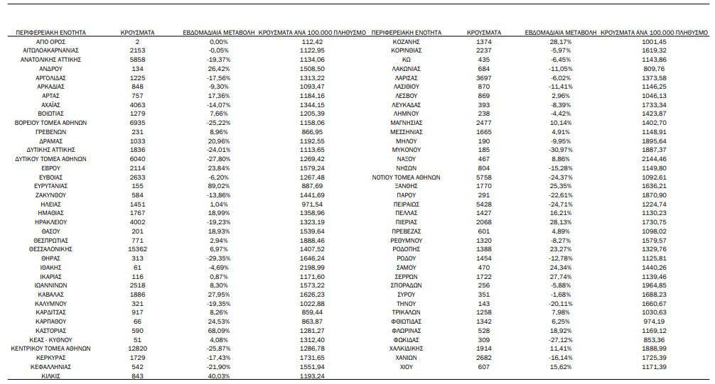 “Την εβδομάδα αναφοράς καταγράφηκαν 136.077 κρούσματα COVID-19 (13.044 ανά εκατoμμύριο πληθυσμού: -9% εβδομαδιαία μεταβολή) εκ των οποίων οι επαναλοιμώξεις αφορούν το 19% των λοιμώξεων.